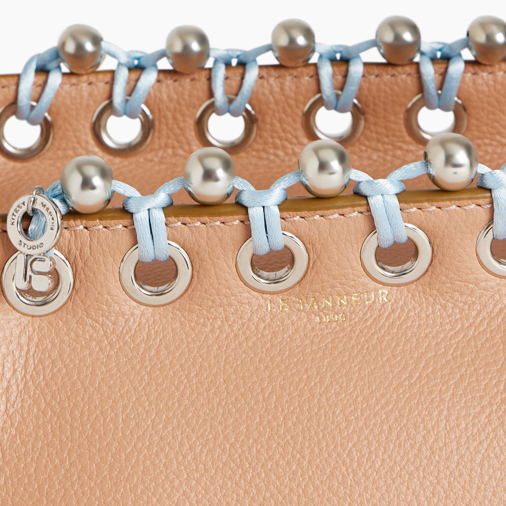 Je suis arrivée dans la bijouterie par le design textile. Je travaille donc le bijou d’une manière différente d’un artisan joaillier ou un designer spécialisé. Avec Le Tanneur, l’idée était de créer un sac-bijou en partant du sac Louise. Nous avons intégré à notre tressage des perles métalliques, posé des œillets pour un effet « bijou ».